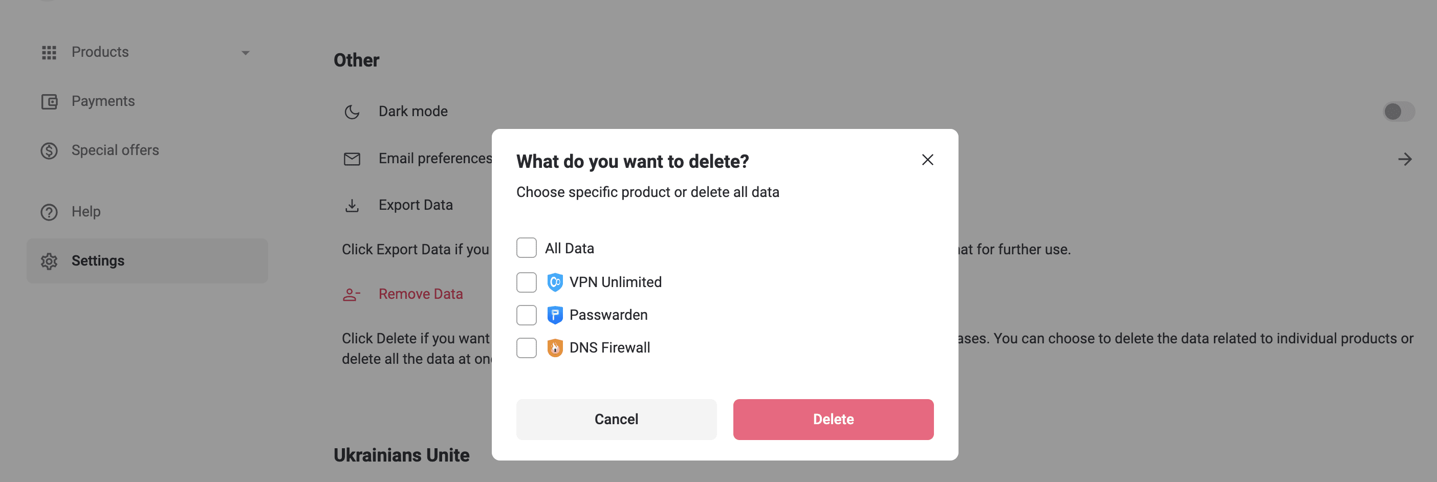 - To delete your entire KeepSolid account and all associated data: Choose All Data and click Delete.