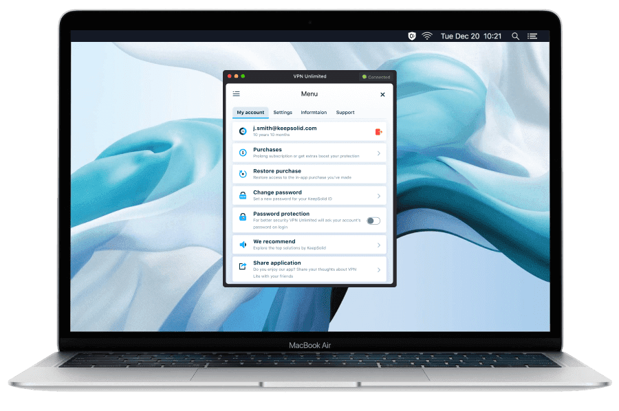 To learn more about how to install and use VPN Unlimited on your Mac, please go to Help - Manuals. If you need any help, please check our FAQ or contact our customer support team.